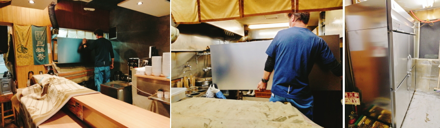 2023、4月、浅草の人気ラーメン 冷凍冷蔵庫の入替え、客席と厨房の2箇所のカウンター越し、扉と冷凍機外して搬入、厨房内で組み合わせ。既存人の撤去処分もあり、4人で搬入設置。ホシザキ冷凍冷蔵庫、定価1,678,000円と既存撤去処分、全て込みで月々11,000円の5年リースで販売。ちなみに3社の相見積でした。
