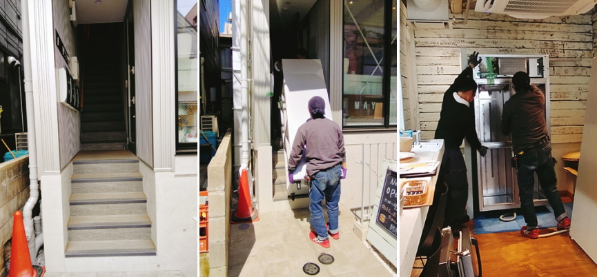2023、6月、世田谷のカフェへ冷蔵庫を納品、入口に階段あり、搬入通路が狭いため扉を外して3人で搬入する。パナソニックのW900冷凍冷蔵庫、定価1,343,000円と作業台39,000円を合わせて、月々6,800円の6年リースで販売。現場確認+搬入設置+納品立会い等含みます。