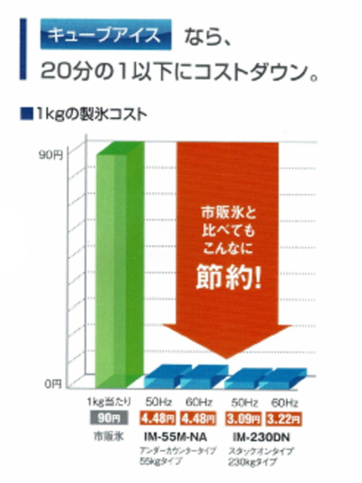 製氷コストはキューブアイスで20分の1以下、チップアイスやフレークアイスなら更にコストダウン!